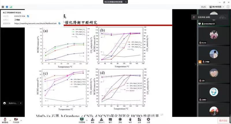 2022年11月4日上午,化工学院在线上,举办第229期必赢626net入口首页院级学术交流阳光论坛。本次论坛分别邀请了化工学院彭帅博士作了题为“农林固废制备生物炭及其复合材料催化VOCs氧化的研究”的学术报告,化工学院熊俊博士作了题为“生物质基光热转换材料的设计及其太阳能水净化性能的研究”的学术报告。论坛由化工系卫老师主持,学院教师、研究生及本科生代表参与了聆听。